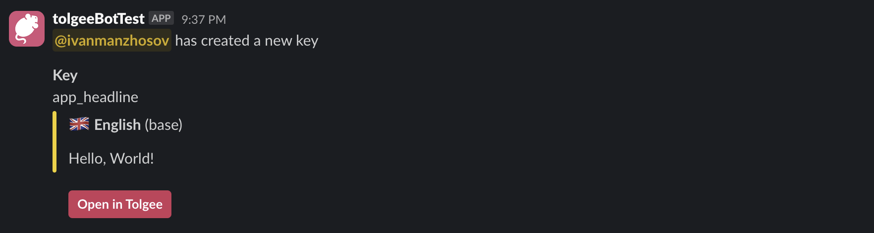That's it! You're now equipped to manage your project notifications effectively using the Tolgee bot in Slack.